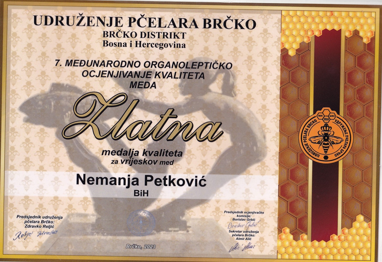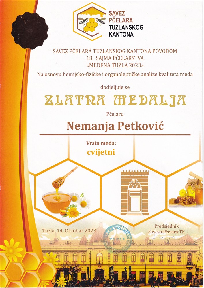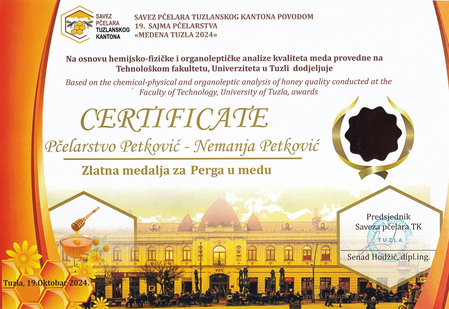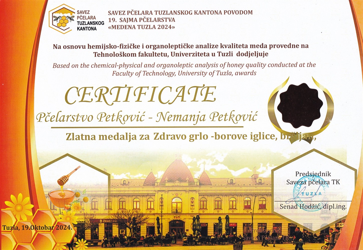 Samo u Tuzli 2024. godina osvojio je 5 zlatnih medalja: za livadski med, za vrijeskov med, za Zdravo grlo (sirup protiv kašlja), za pergu i med i za propolis kremu.