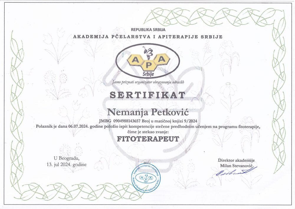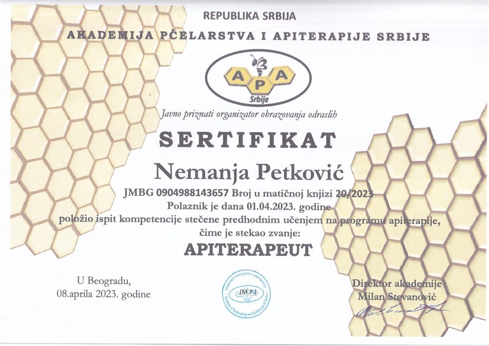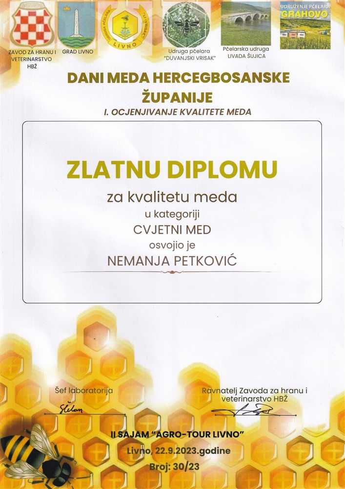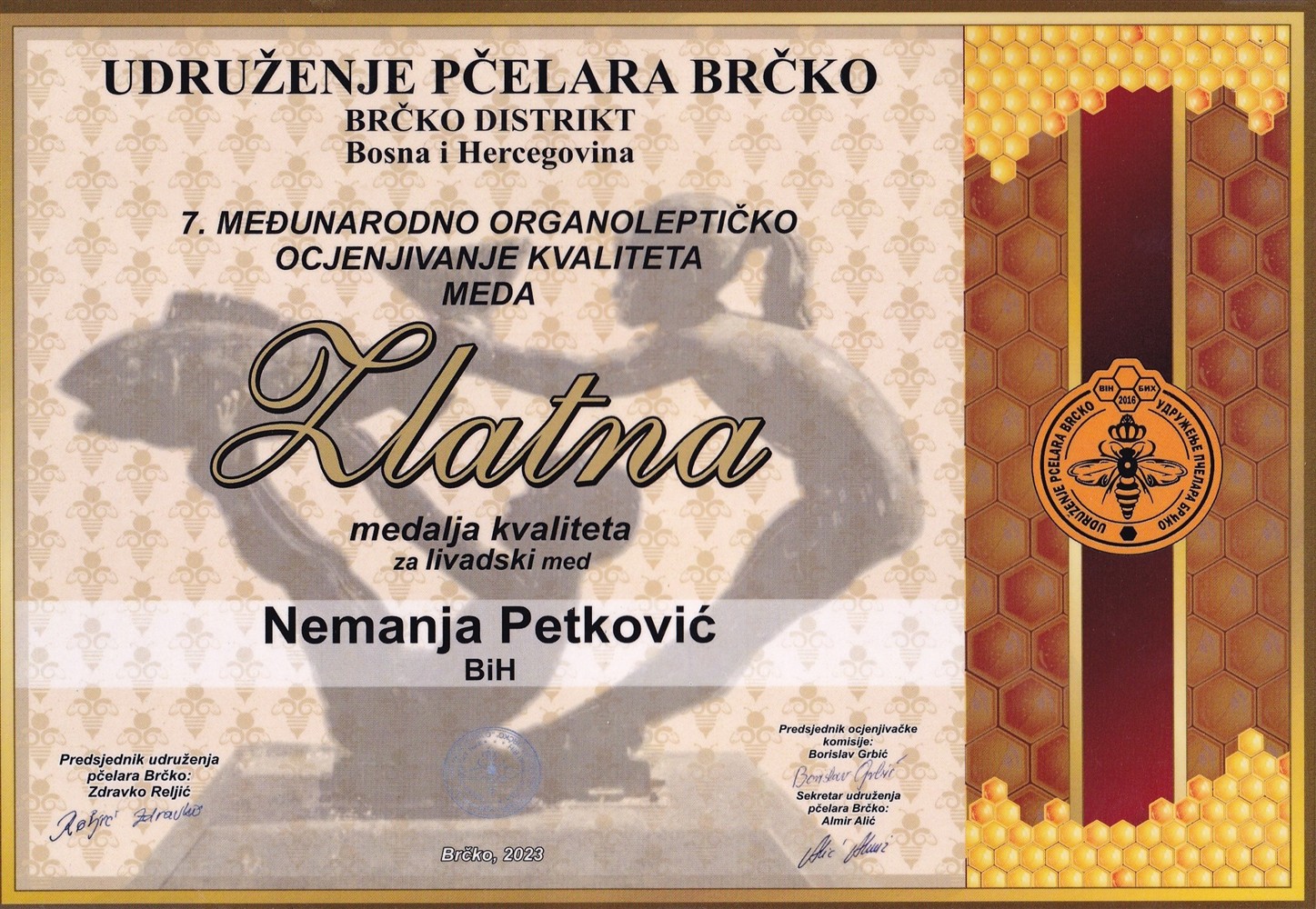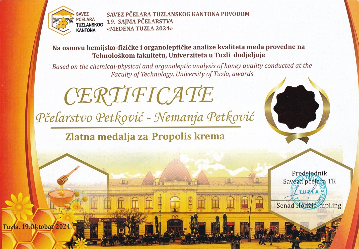 Samo u Tuzli 2024. godina osvojio je 5 zlatnih medalja: za livadski med, za vrijeskov med, za Zdravo grlo (sirup protiv kašlja), za pergu i med i za propolis kremu.